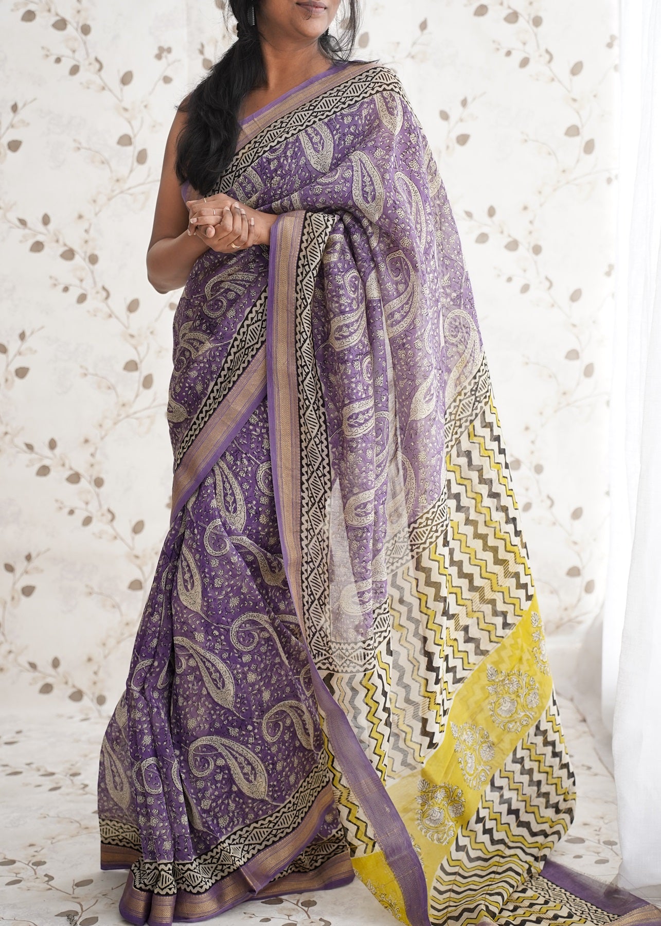A fusion of Paisleys, chevrons and color play - Bold yet beautifully balanced.